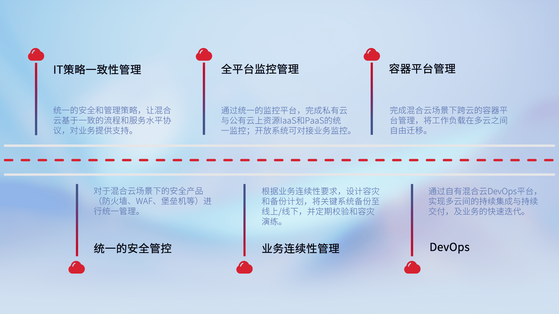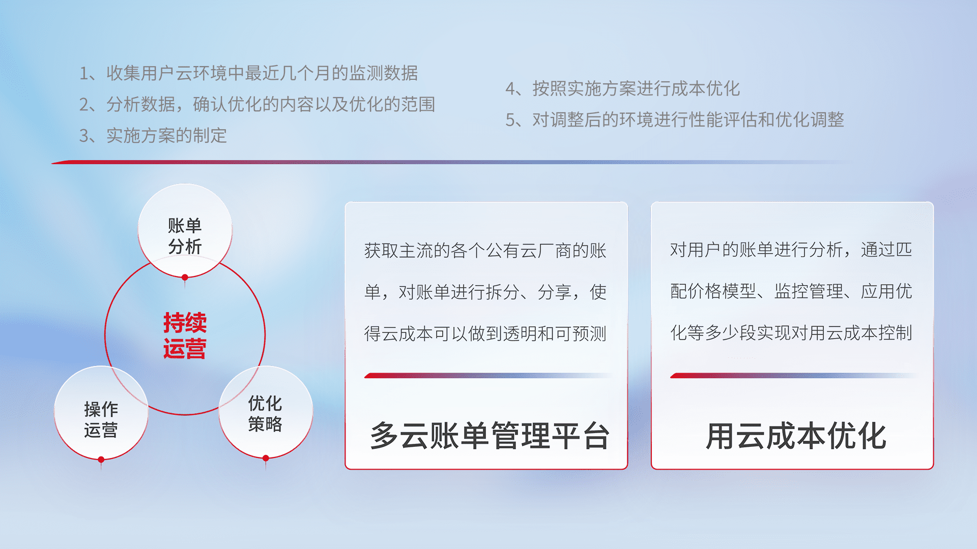 通过多云纳管,,,,以统一的资源数据模型把客户的云资源进行抽象和封装,,,进而实现对多云资源的统一操作,,,,保障云资源管理的可靠性、、、、稳定性与可用性。。。。量身定制化运维内容,,,,配置、、开发运维、、补丁管理、、、备份、、、、监控、、、、认证和访问管理、、、审计和日常巡检等,,保障在用云过程中的可靠度,,,,稳定度以及高可用率。。。